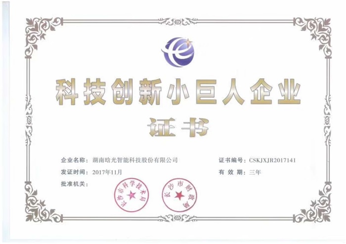 11月8日,湖南晗光智能科技股份有限公司獲長沙市科學技術局和長沙市財政局聯合頒發的“科技創新小巨人企業”稱號!